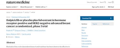 11月4日,国际四大医学期刊之一、英国《自然》旗下《自然医学》(Nature Medicine)在线发表CDK4/6抑制剂达尔西利(SHR6390)联合氟维司群治疗既往内分泌治疗后疾病进展的HR+/HER2-晚期乳腺癌的多中心、随机、双盲III期临床研究(DAWNA-1研究)中期分析结果报告,首次对氟维司群(雌激素受体降解剂)±达尔西利治疗激素受体阳性晚期乳腺癌的有效性和安全性进行了比较。研究结果显示,达尔西利+氟维司群组与安慰剂+氟维司群组相比,无进展生存期(PFS)显著延长。该项研究由中国医学科学院肿瘤医院徐兵河教授担任leading PI,全国39家医院参研,由永利娱乐城医药临床研发团队支持完成。