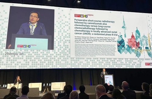 10月21日,永利娱乐城医药创新药卡瑞利珠单抗(艾瑞卡®)的一项研究“新辅助短程放疗序贯卡瑞利珠单抗联合化疗对比长程放化疗序贯化疗治疗局部晚期直肠癌”随机对照Ⅲ期试验(UNION) 以优选口头报告的形式正式亮相。该研究由华中科技大学同济医学院附属协和医院张涛教授、陶凯雄教授担任主要研究者,华中科技大学同济医学院附属协和医院林振宇教授在马德里现场报告了该重磅研究的结果1,此项研究是全球首个评估短程放疗序贯免疫治疗联合化疗治疗局部晚期直肠癌的Ⅲ期研究,已达到主要终点病理完全缓解(pCR),有望为直肠癌患者的治疗提供新策略。
