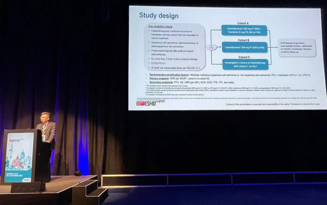 有望为宫颈癌患者带来治疗新选择10月22日,永利娱乐城医药创新药卡瑞利珠单抗联合法米替尼对比卡瑞利珠单抗单药或研究者选择的化疗治疗复发转移性宫颈癌随机、开放、对照、多中心的Ⅱ期临床研究(SHR-1210-Ⅱ-217) 亮相2023 ESMO大会简短口头报告现场3。该研究由复旦大学附属肿瘤医院吴小华教授团队开展,吴小华教授在现场公布了该重磅研究进展。研究结果显示,在既往以铂为基础化疗失败后复发或转移性宫颈癌患者中,与单独使用卡瑞利珠单抗或研究者选择的化疗相比,卡瑞利珠单抗联合法米替尼显著提高了抗肿瘤活性,安全性可控,有望为晚期宫颈癌患者提供新的治疗选择。